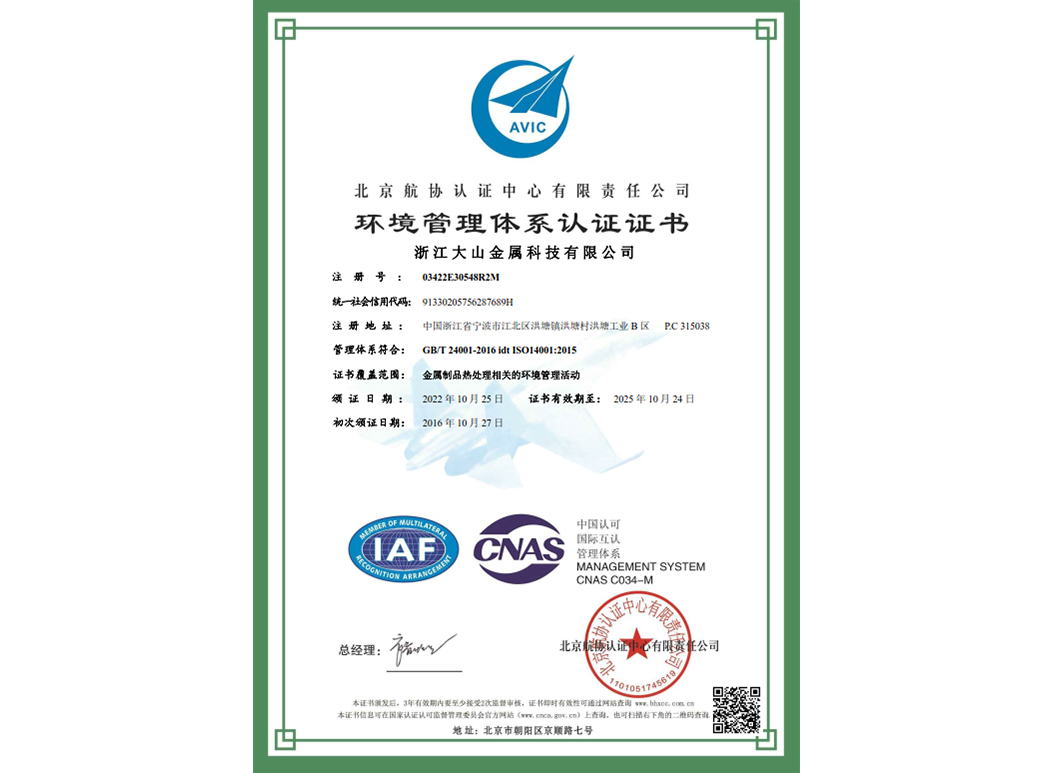 經過近35年來不斷引進先進的熱處理設備和技術,使企業具備了雄厚的產品熱處理工藝開發和生產能力,在熱處理行業中取得了令人矚目的業績,在客戶中建立了良好的口碑。本企業已通過IATF 16949:2016 質量管理體系、GB/T24001-2016 idt ISO14001:2015 環境管理體系、ISO 45001:2018 職業健康安全管理體系認證,正全面貫徹執行相關管理體系標準,為客戶提供更有保證的全面服務。大山愿與各界朋友攜手共進,為提高熱處理質量不斷努力!